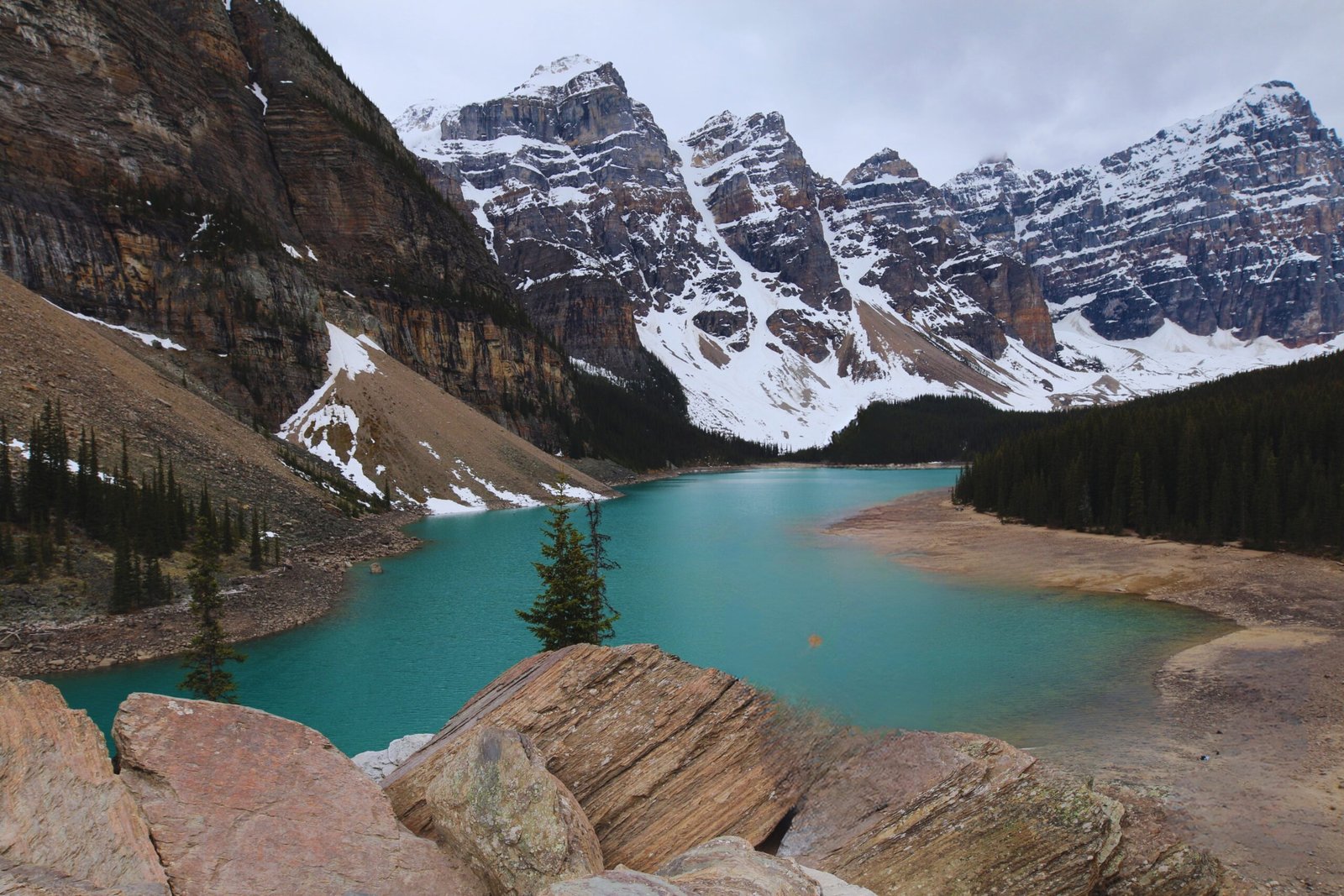 1.5 hours at Moraine Lake, 1 hour at Lake Louise